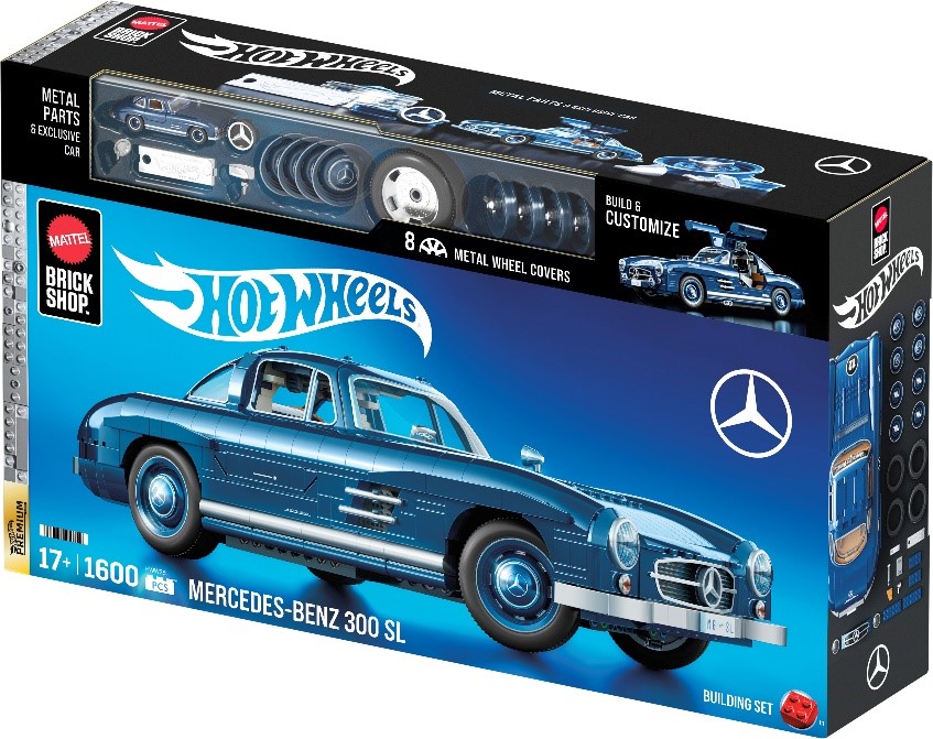 • Mattel Brick Shop™ Hot Wheels™ Mercedes-Benz 300 SL: The legendary Gullwing, reimagined in 1:12 scale with opening doors, a metal Mercedes-Benz crest, and luxe interior detailing. Comes with a matching 1:64 die-cast metal car.