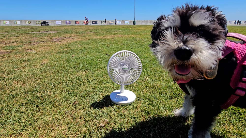 My favourite aspect about the fan is how portable it is! I simply picked up the fan and used it around the home to keep cool at my desk, next to my bed, on my recliner, in the kitchen, in the lounge, on the balcony and in the garden. And with no cables, this was such a nice experience. I then took the fan with me during a walk and kept cool while sitting on the Promenade grass with my dog! It is so portable, I even took the fan with me during a bicycle ride and kept cool while taking a break.